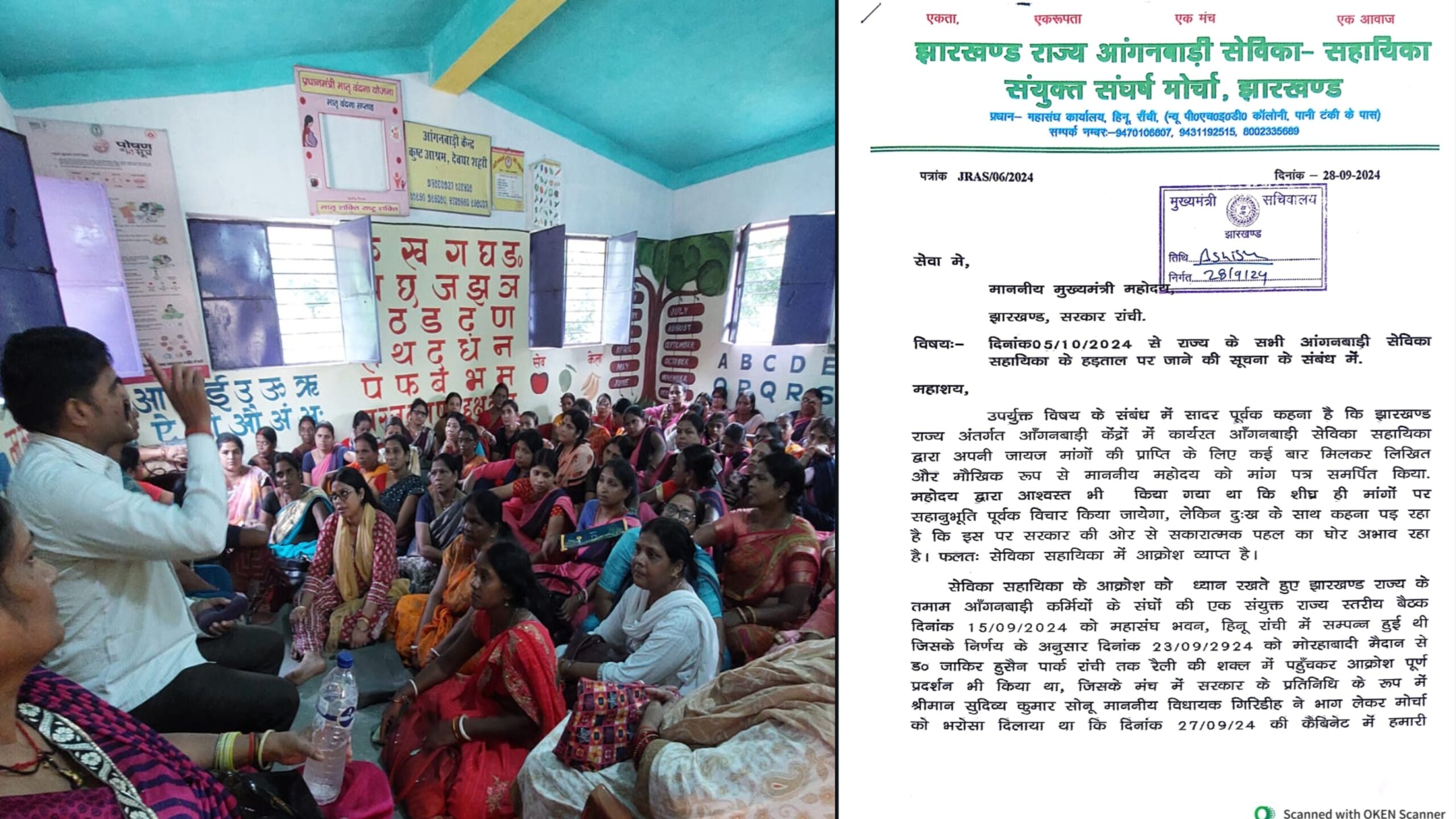 झारखंड राज्य आँगनबाड़ी सेविका-सहायिका संयुक्त संघर्ष मोर्चा, झारखंड के ने राज्य के आँगनबाड़ी सेविका-सहायिका द्वारा 5 अक्टूबर, 2024 से अनिश्चितकालीन हड़ताल की घोषण किया इसके लिए घोषणा पत्र जारी किया ।