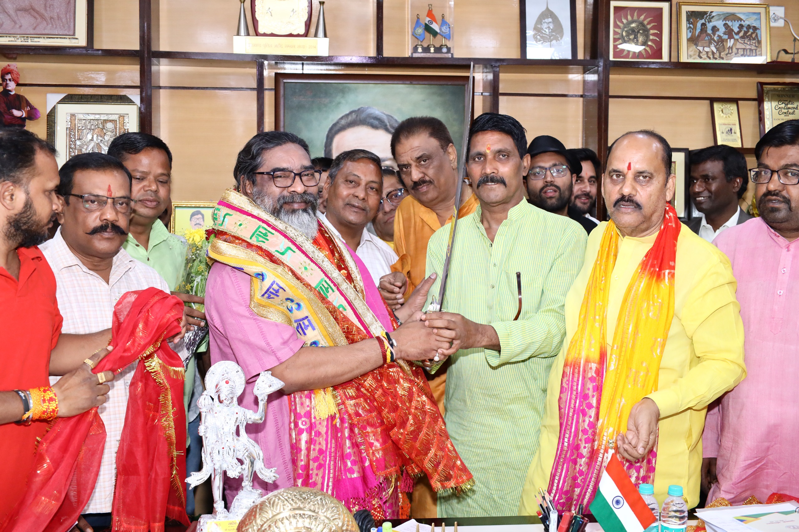 मुख्यमंत्री श्री हेमन्त सोरेन से आज कांके रोड, रांची स्थित मुख्यमंत्री आवासीय कार्यालय में केंद्रीय समिति श्री महावीर मंडल, रांची के एक प्रतिनिधिमंडल ने मुलाकात की। इस अवसर पर मुख्यमंत्री को प्रतिनिधिमंडल के सदस्यों ने आगामी 6 अप्रैल 2025 को रामनवमी महोत्सव के शुभ अवसर पर आयोजित होने वाले भव्य शोभायात्रा में सपरिवार सम्मिलित होने हेतु सादर आमंत्रित किया। मौके पर मुख्यमंत्री श्री हेमन्त सोरेन को प्रतिनिधिमंडल के सदस्यों ने रामनवमी के प्रतीक के रूप में श्री हनुमान जी की मूर्ति एवं गदा सप्रेम भेंट की। इस अवसर पर मुख्यमंत्री ने अपनी ओर से प्रतिनिधिमंडल के सदस्यों को रामनवमी महोत्सव की हार्दिक बधाई एवं शुभकामनाएं दी।